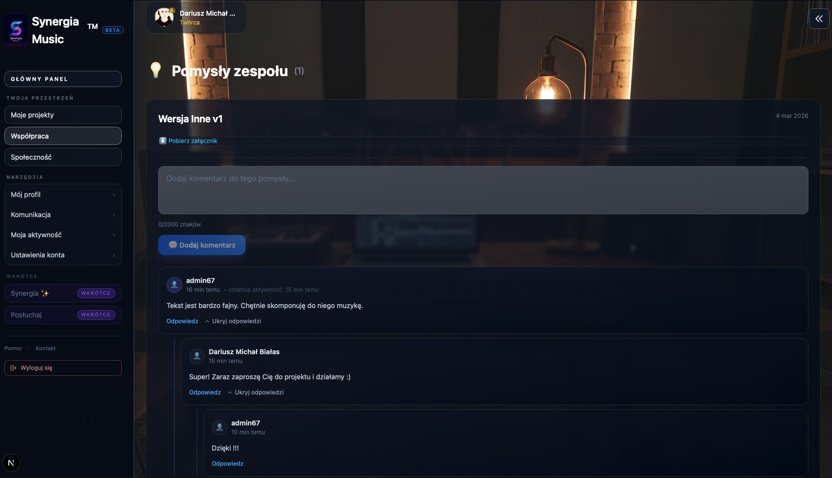 "Relacje to nieodzowny element branży muzycznej, a Synergia pozwoli na znacznie łatwiejszy dostęp do komunikacji, świetny pomysł, sam będę używał!"